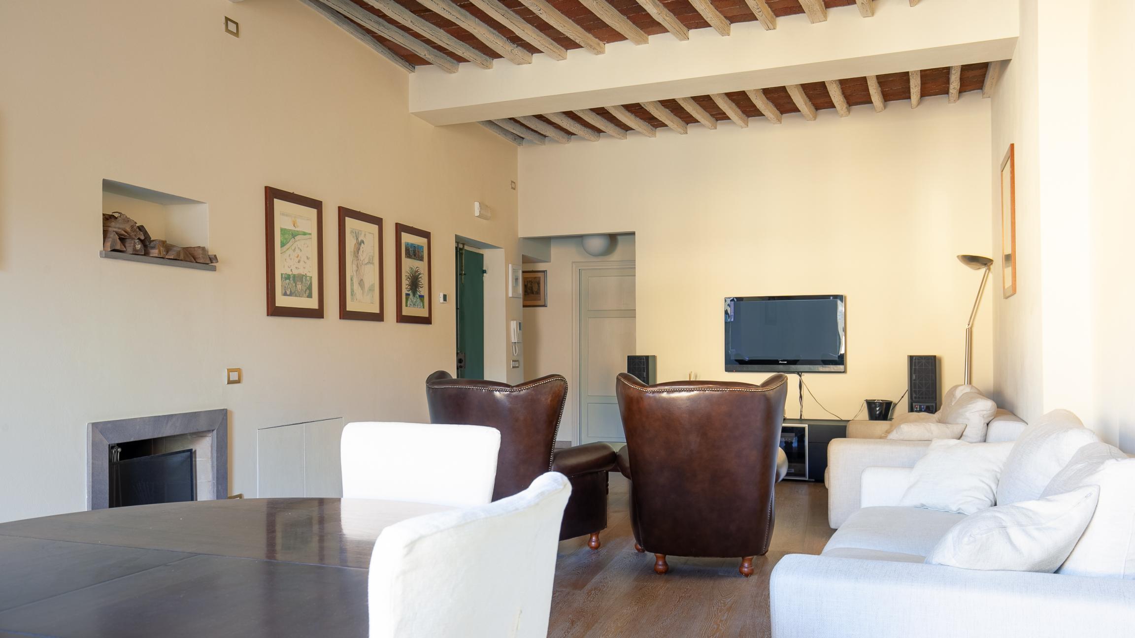 Zona Living: Un ampio salone di rappresentanza con scenografico caminetto e soffitti con travi a vista, perfetto per ammirare il passaggio in Piazza Anfiteatro dalle finestre dedicate.