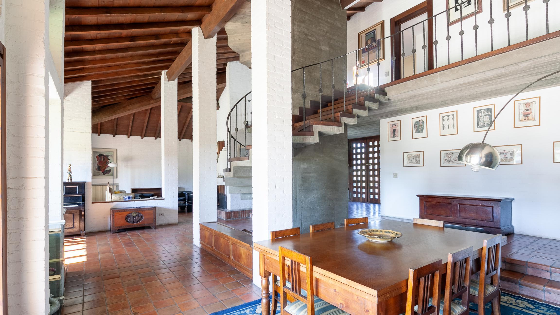 La villa si dispone su due livelli oltre mansarda abitabile, nel corpo principale si accede da ampio portone in legno a bozze e vetro ingresso disimpegno su meravigliosa sala con doppio volume soggiorno living diviso in tre zone aperte con camino e caratteristica scala in cemento e legno, un ampio ingresso su cui si sviluppa la sala luminosissima con plurivetrate suddivisa in più ambienti, aperti ma ben definiti, , studio, cucina abitabile, tre camere, bagno e porticato, al piano superiore camera matrimoniale, bagno e terrazza panoramica con vista sulle colline lucchesi. Dal primo piano si puó accedere anche all'altra unità immobiliare, che ha comunque il suo ingresso indipendente con scala esterna, composta sala con camino e cucina a vista, due camere e bagno, con una scala a chiocciola comoda si accede alla mansarda composta da tre camere e bagno.