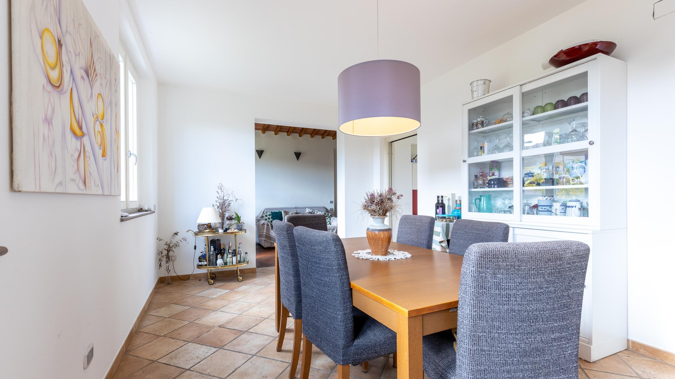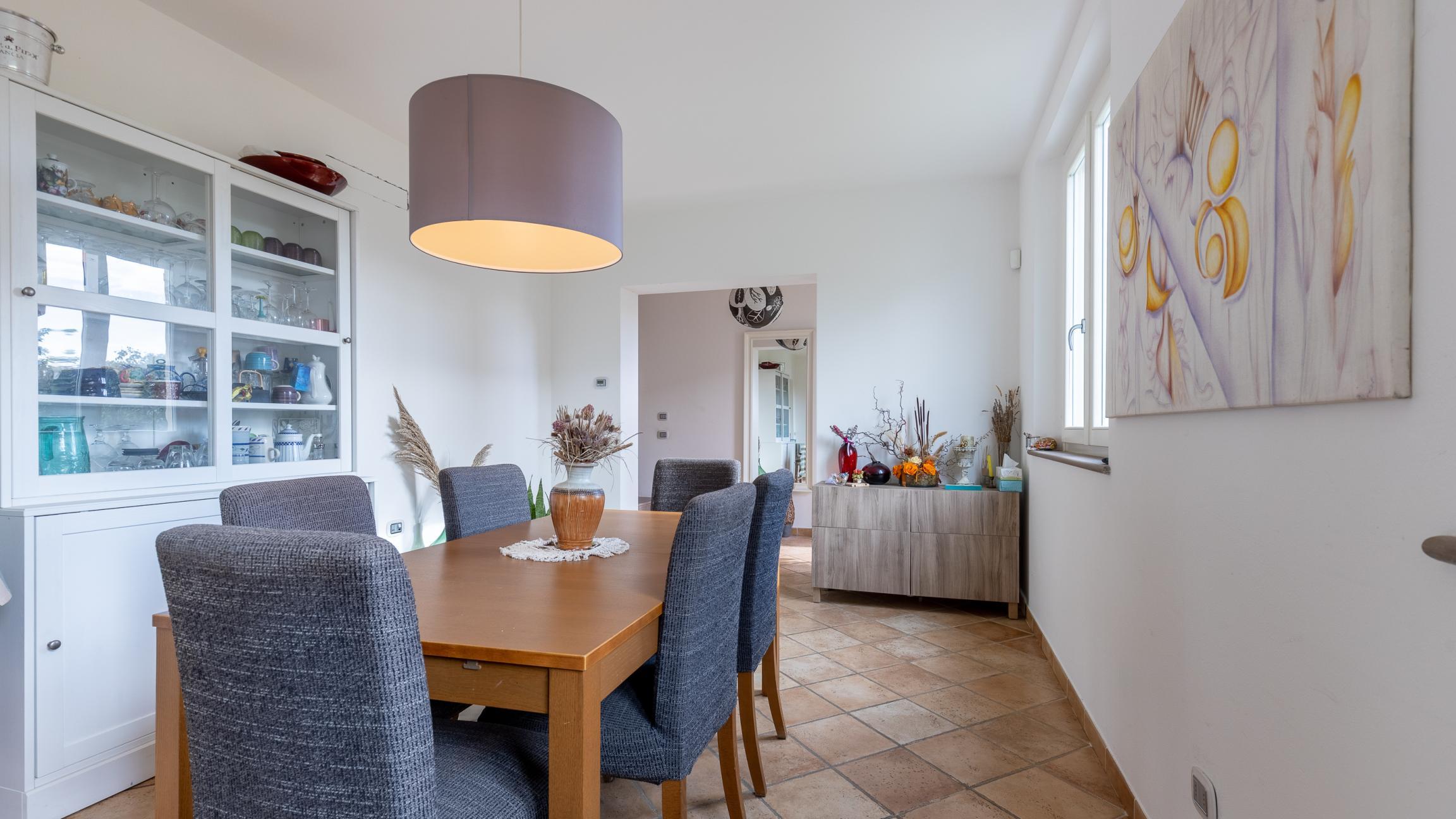 La villa è composta da ingresso, soggiorno, sala con camino e bagno a piano primo; due camere, uno studio e un bagno a piano primo, vano tecnico, taverna e locali di servizio al piano interrato.