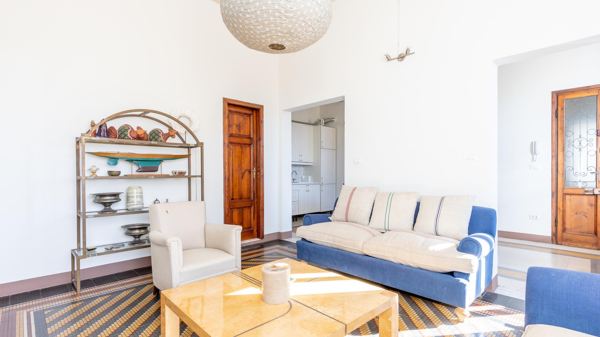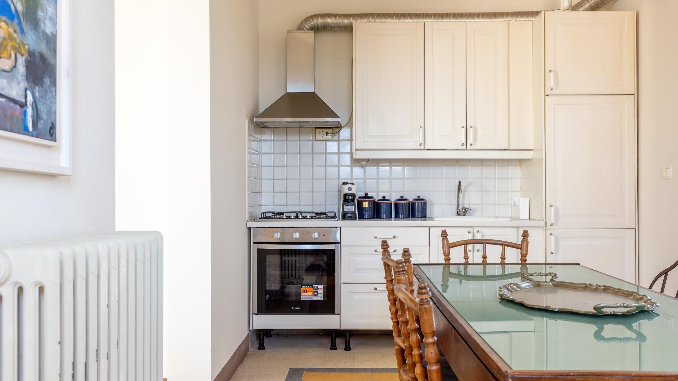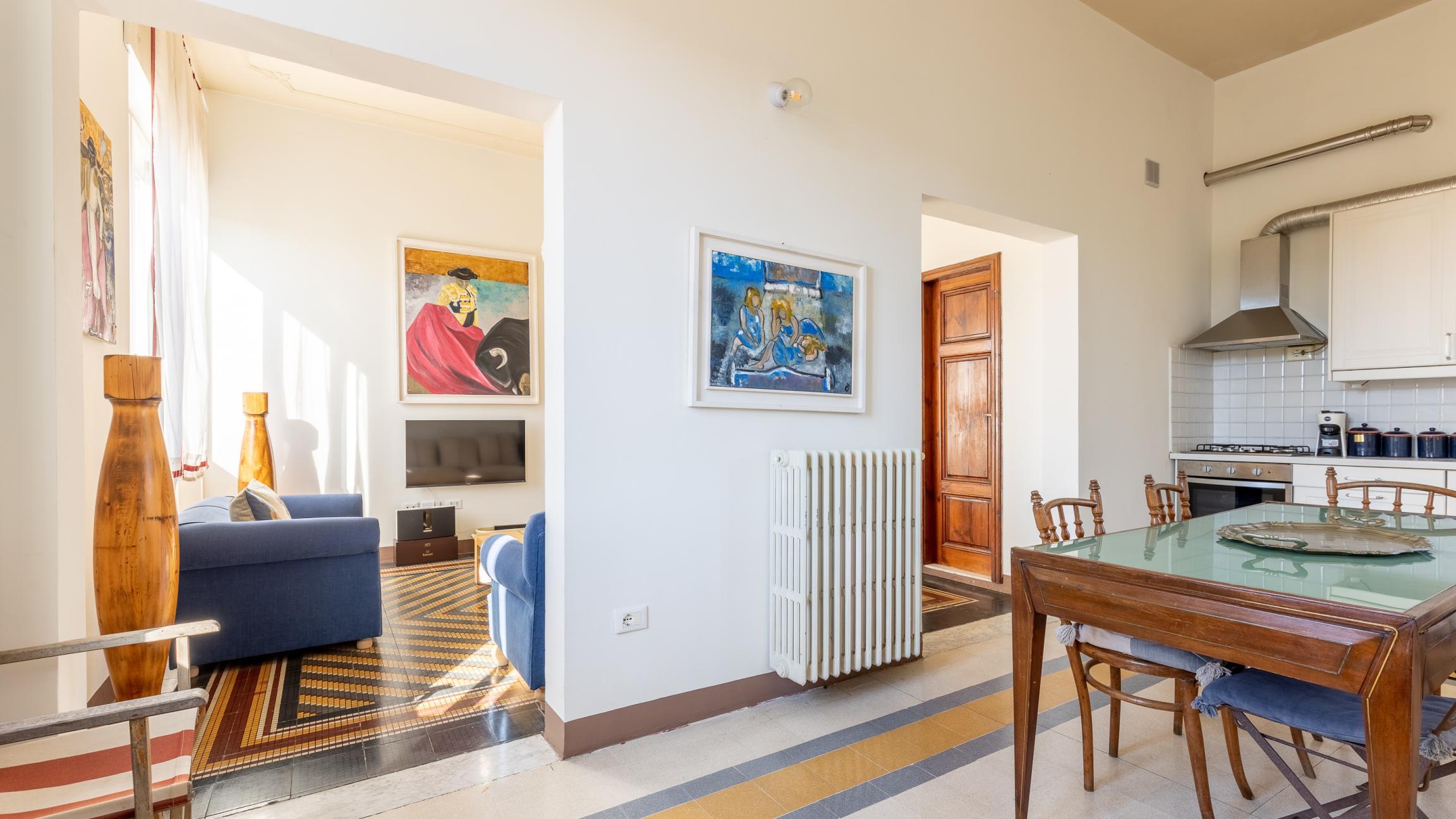 L'appartamento è caratterizzato dai soffitti alti e dai pavimenti caratteristici dell'epoca, oltre alle finestre ampie che si affacciano principalmente a sud.