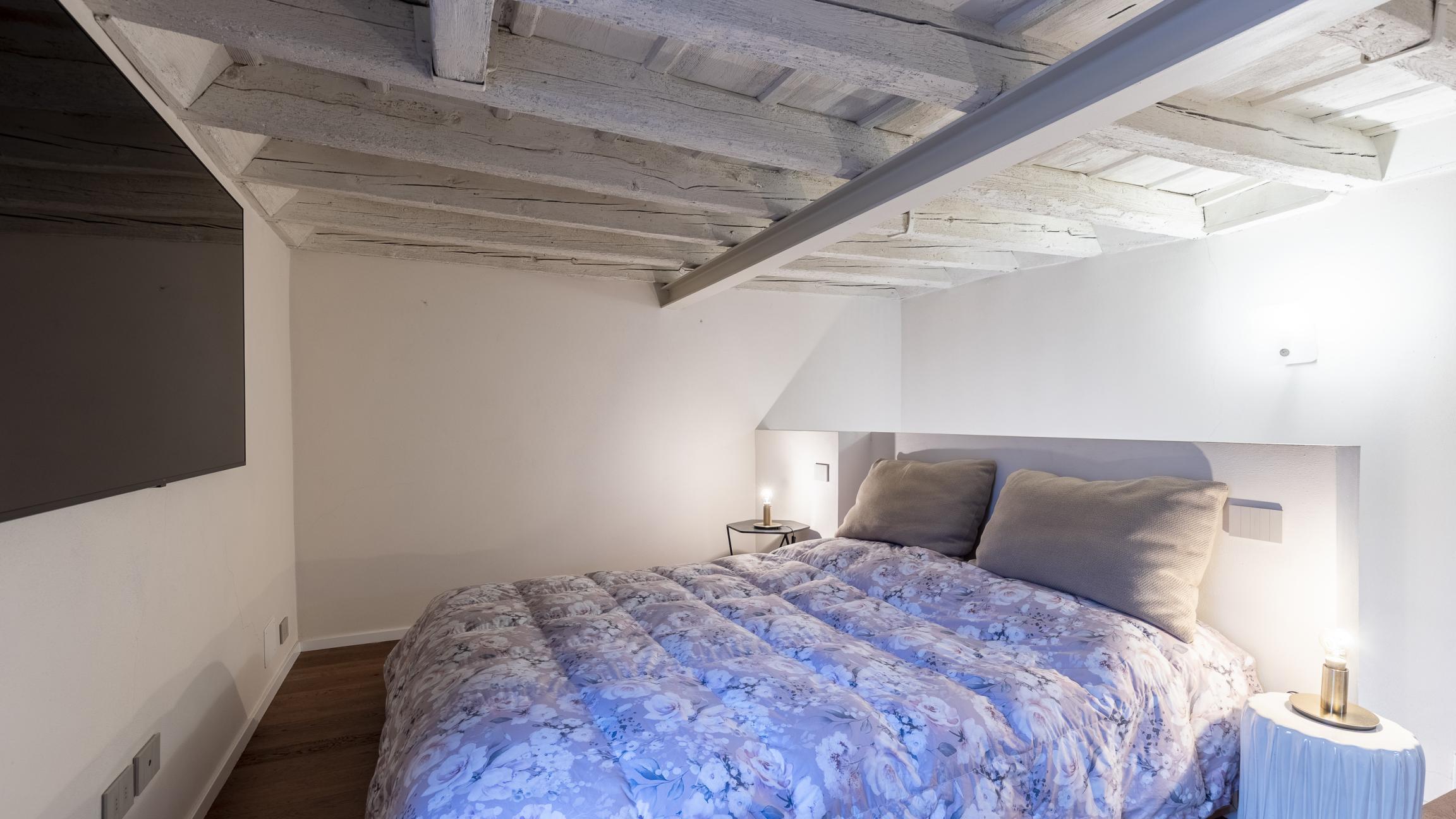 Completano il piano un bagno ampio ed elegante, mentre la camera soppalcata offre uno spazio intimo e suggestivo, arricchito da una zona armadi a vista dal forte impatto estetico.