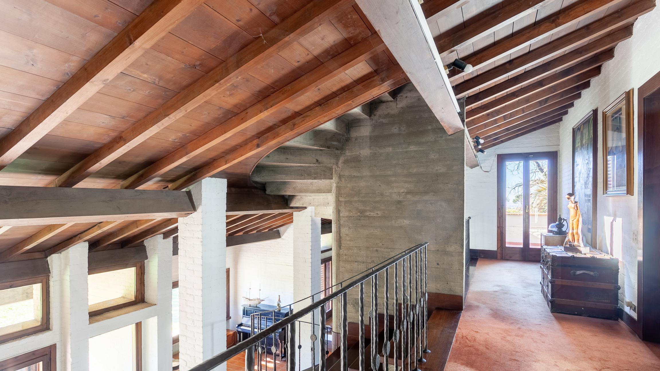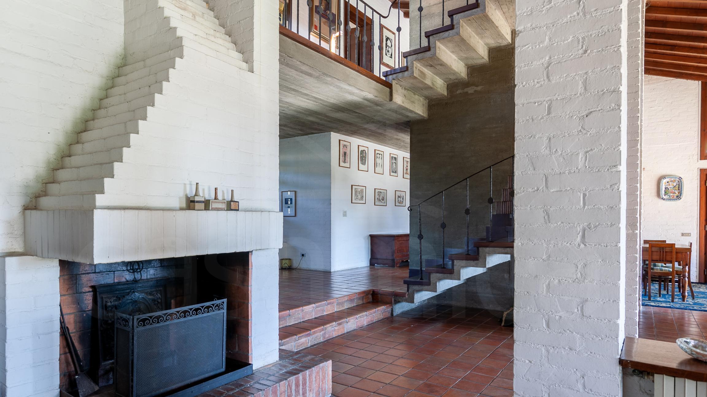 La villa si dispone su due livelli oltre mansarda abitabile, nel corpo principale si accede da ampio portone in legno a bozze e vetro ingresso disimpegno su meravigliosa sala con doppio volume soggiorno living diviso in tre zone aperte con camino e caratteristica scala in cemento e legno, un ampio ingresso su cui si sviluppa la sala luminosissima con plurivetrate suddivisa in più ambienti, aperti ma ben definiti, , studio, cucina abitabile, tre camere, bagno e porticato, al piano superiore camera matrimoniale, bagno e terrazza panoramica con vista sulle colline lucchesi. Dal primo piano si puó accedere anche all'altra unità immobiliare, che ha comunque il suo ingresso indipendente con scala esterna, composta sala con camino e cucina a vista, due camere e bagno, con una scala a chiocciola comoda si accede alla mansarda composta da tre camere e bagno.